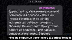 В чате детсадовской группы для четырехлетних малышей воспитатели попросили сделать фотографию, как бабушки с внуками смотрят фильм о блокаде Ленинграда, рассказывает Анастасия из Новосибирска, чей сын ходит в эту группу.